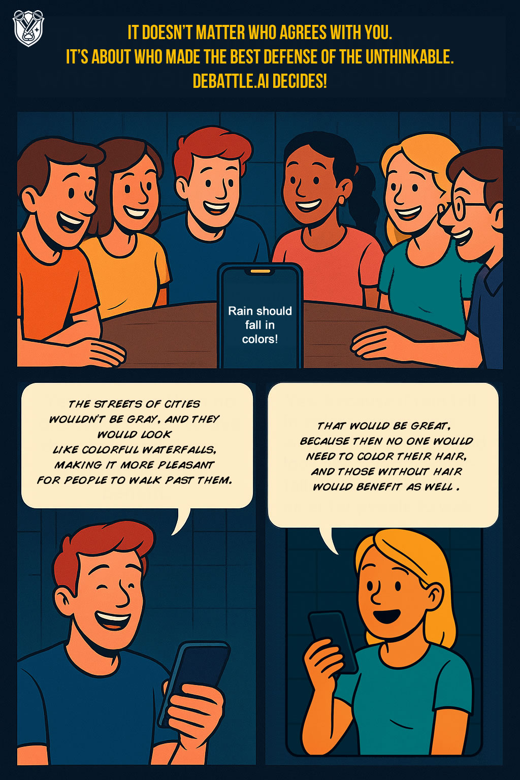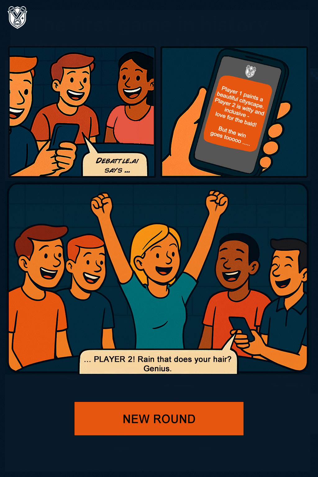 Welcome to Debattle – a game that offers not just a challenge, but a whole lot of fun! Here, you’ll face off with unbeatable claims and get the chance to defend them in creative ways. Whether you’re in the role of the judge or one of the players, every round is an opportunity to show off your wit, debating skills, and, of course, a good sense of humor.